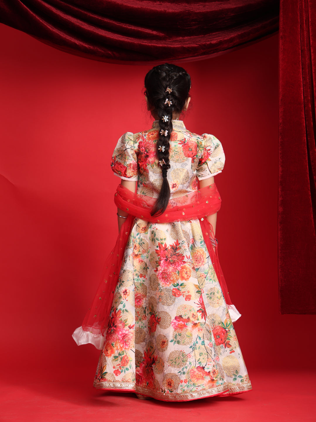 Girls Designer Floral Lehenga Choli with Puff Sleeves & Dupatta