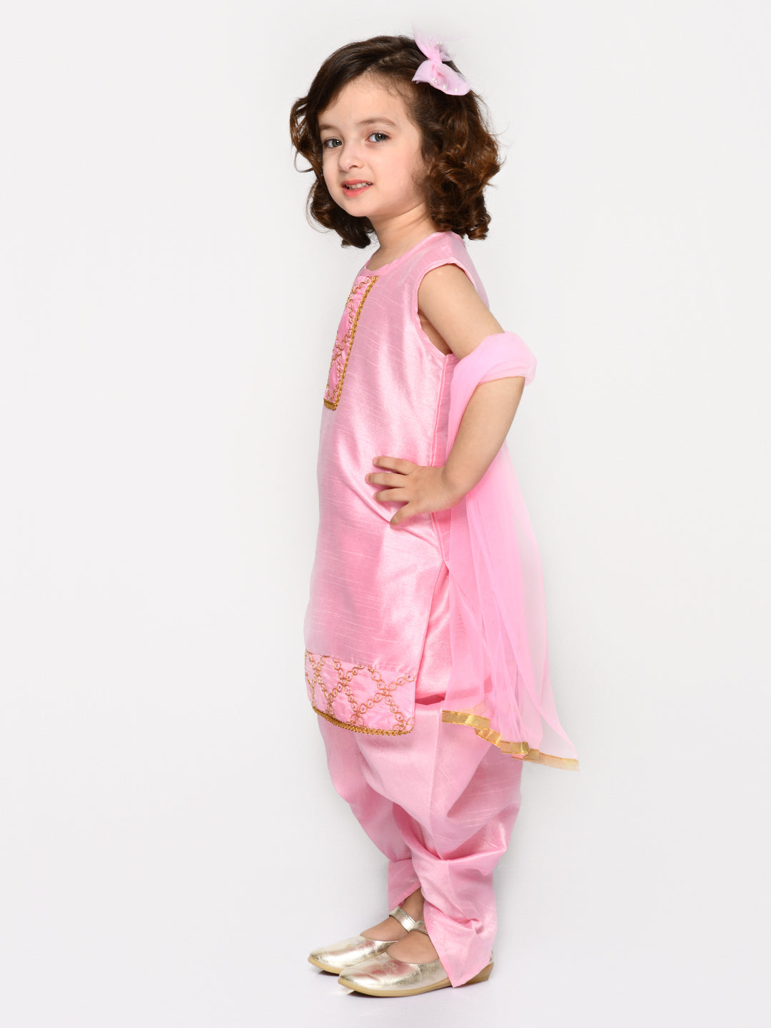 Saka Designs Baby Pink Dhoti Kurta With Embroidery On Yoke & Dupatta