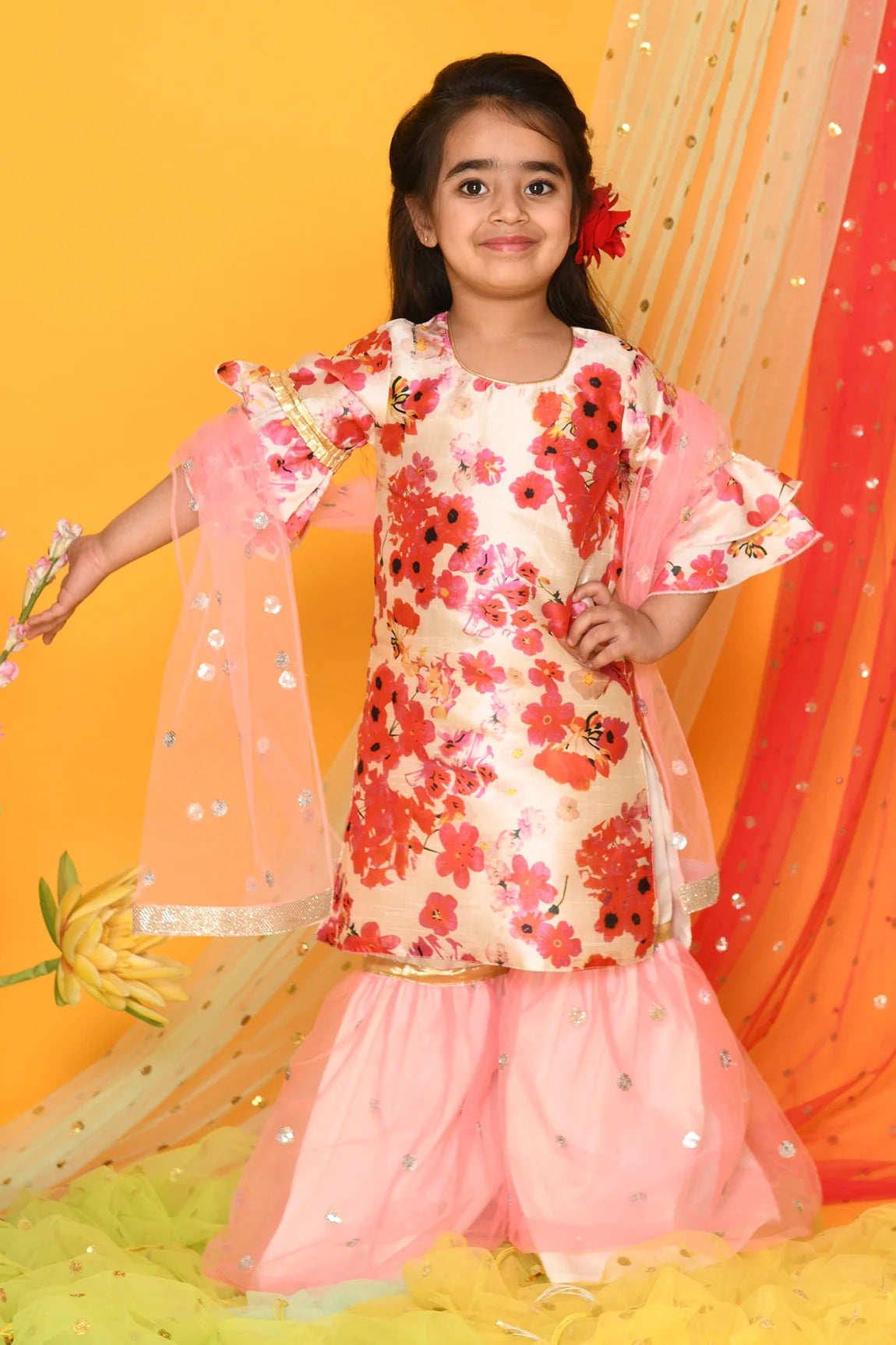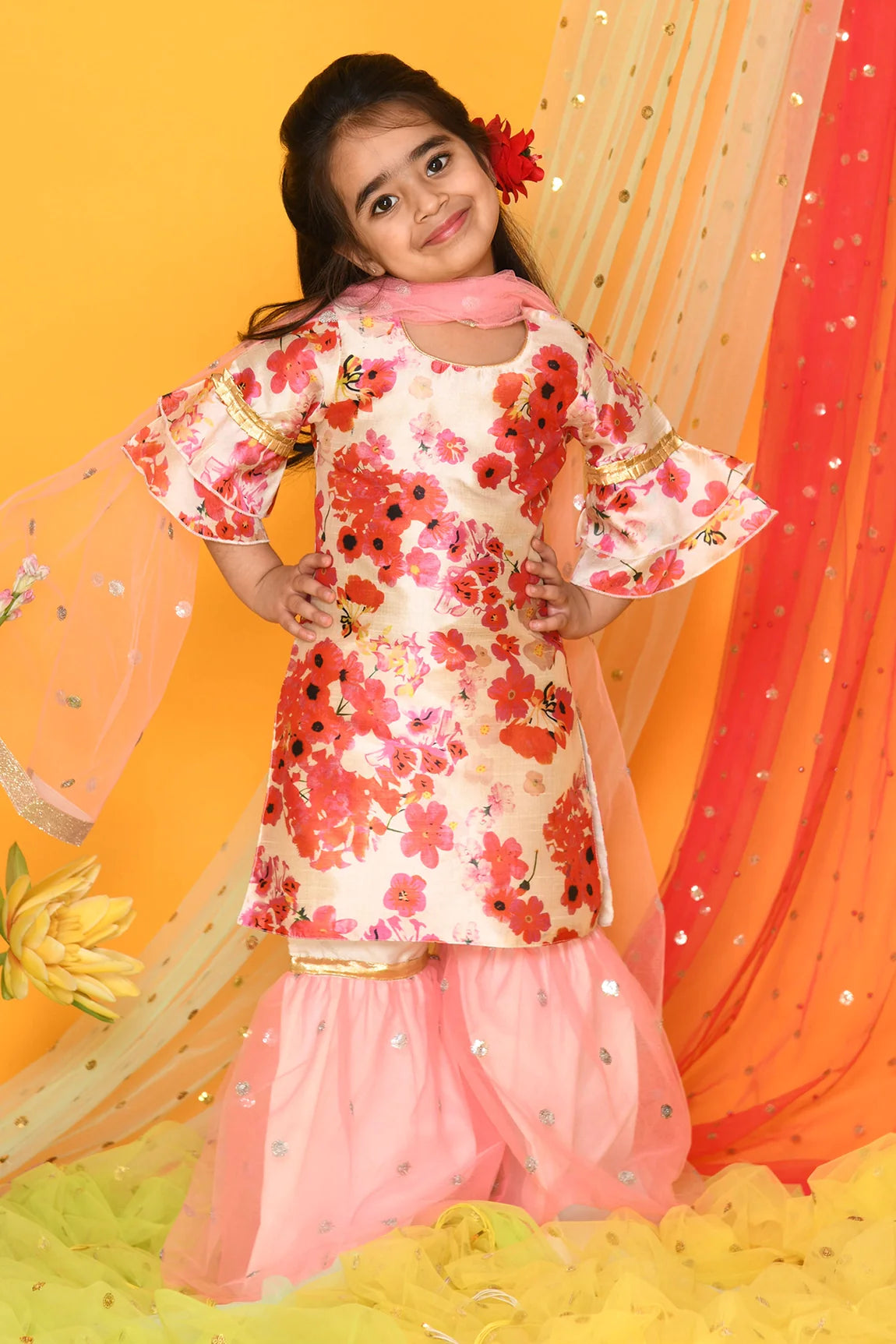Saka Designs Girl Floral Print Pink Kurta With Sharara & Dupatta