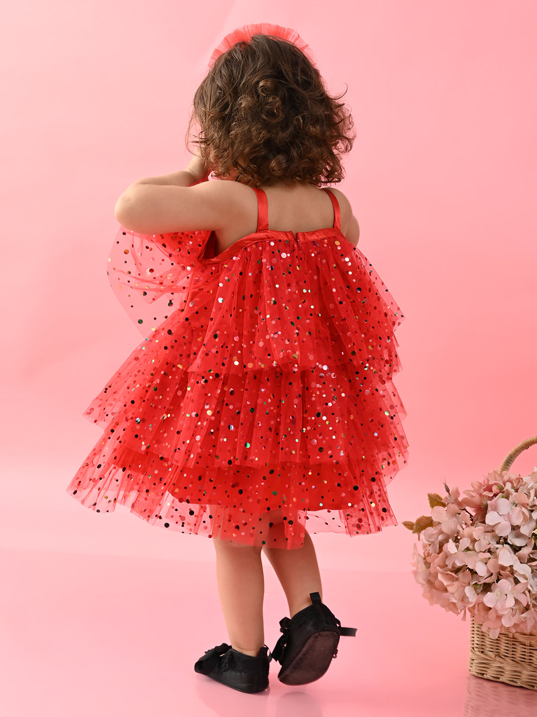Super cute and adorable, this glittered and glamorous Red party frock should definatly be on your list. The dress has layers of shimmer net & comes with a comfortable inner in soft fabric . The dress is super cute & comfortable and is sure to get many compliments when worn by your child. The dress is ideal for any get together or a party whatsoever. Pair it with a head clip for an extra oomph.