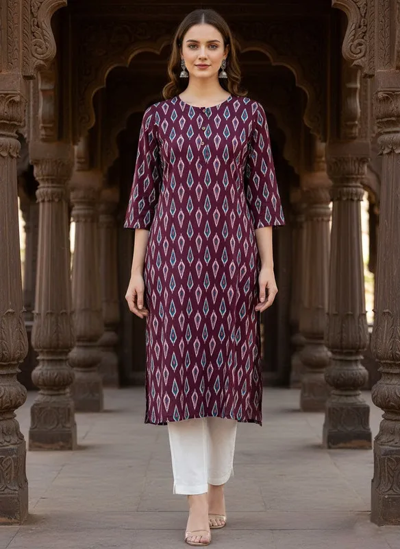 Printed 3/4 Sleeves Straight Kurti Purple (Kurti-32)