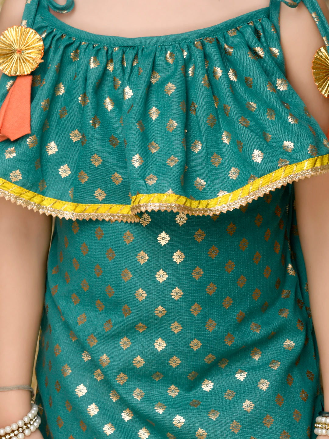 Saka Designs Teal Green Kurta With Orange Dhoti Having All Over Gold Print